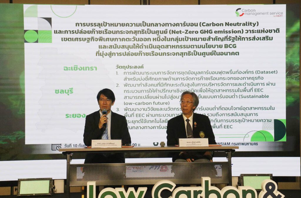 รศ.ดร.สุวิทย์ แซ่เตีย อธิการบดีมหาวิทยาลัยเทคโนโลยีพระจอมเกล้าธนบุรี (มจธ.) กล่าวว่า ในฐานะสถาบันอุดมศึกษาที่มุ่งมั่นสร้างสรรค์นวัตกรรมเพื่อสังคมอย่างยั่งยืน มจธ. ได้ก้าวขึ้นเป็นผู้นำในการขับเคลื่อนวาระสำคัญระดับชาติ ด้วยการเปิดตัว “Carbon Management Platform” ซึ่งเป็นผลงานจากโครงการภายใต้แผนงานบูรณาการเขตพัฒนาพิเศษภาคตะวันออก (EEC) ประจำปีงบประมาณ พ.ศ. 2567 โดยมีเป้าหมายหลักในการสนับสนุนภาคอุตสาหกรรมในพื้นที่ EEC ซึ่งเป็นศูนย์กลางเศรษฐกิจที่สำคัญของประเทศ ให้สามารถบรรลุเป้าหมายความเป็นกลางทางคาร์บอน (Carbon Neutrality) และการปล่อยก๊าซเรือนกระจกสุทธิเป็นศูนย์ (Net-Zero GHG Emission) ได้อย่างเป็นรูปธรรม
